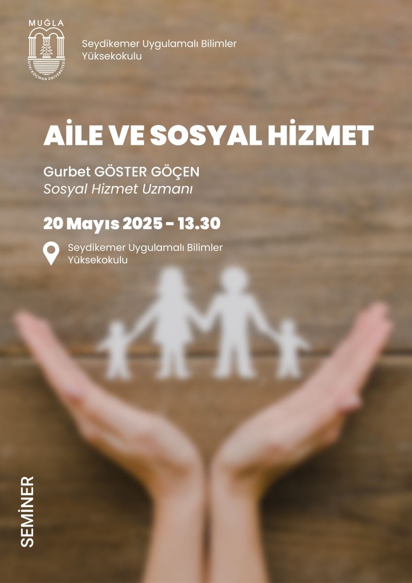 Aile ve Sosyal Hizmet Seminer Etkinliği Yüksekokulumuz Sosyal Hizmet bölümü koordinesinde 20 Mayıs 2025 Salı günü saat 13:30 'da yüz yüze olarak Sosyal Hizmet Uzmanı Sayın Gurbet Göster GÖÇEN tarafından ''Aile ve Sosyal Hizmet'' konulu seminer verilecektir. İlgili öğrencilerimize duyurulur. Son Güncelleme : 14.05.2025 11:01 Okunma Sayısı : 344
