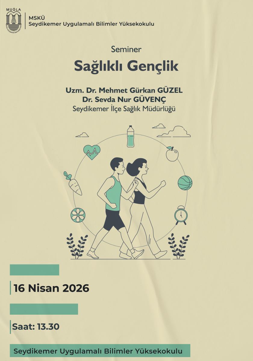 Etkinlik Duyurusu Seydikemer İlçe Sağlık Müdürlüğü tarafından Gençlik Yılı kapsamında Yüksekokulumuz öğrencilerine yönelik 16 Nisan 2026 Perşembe günü saat 13:30'da 6 nolu derslikte ''Sağlıklı Gençlik'' konulu seminer etkinliği düzenlenecektir. Tüm öğrencilerimize duyurulur. Etkinlik Afişi; Son Güncelleme : 15.04.2026 14:31 Okunma Sayısı : 48