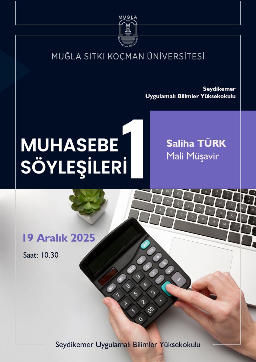 Muhasebe Söyleşileri I Etkinlik Duyurusu Yüksekokulumuz Muhasebe ve Finans Yönetimi bölümü koordinesinde 19 Aralık 2025 Cuma günü saat 10:30'da 6'nolu Derslikte Mali Müşavir Sayın Saliha TÜRK tarafından ''Muhasebe Söyleşileri I'' Etkinliği düzenlenecektir. Muhasebe ve Finans Yönetimi Bölümü Öğrencilerine Duyurulur. Etkinlik Afişi; Son Güncelleme : 11.12.2025 09:02 Okunma Sayısı : 38